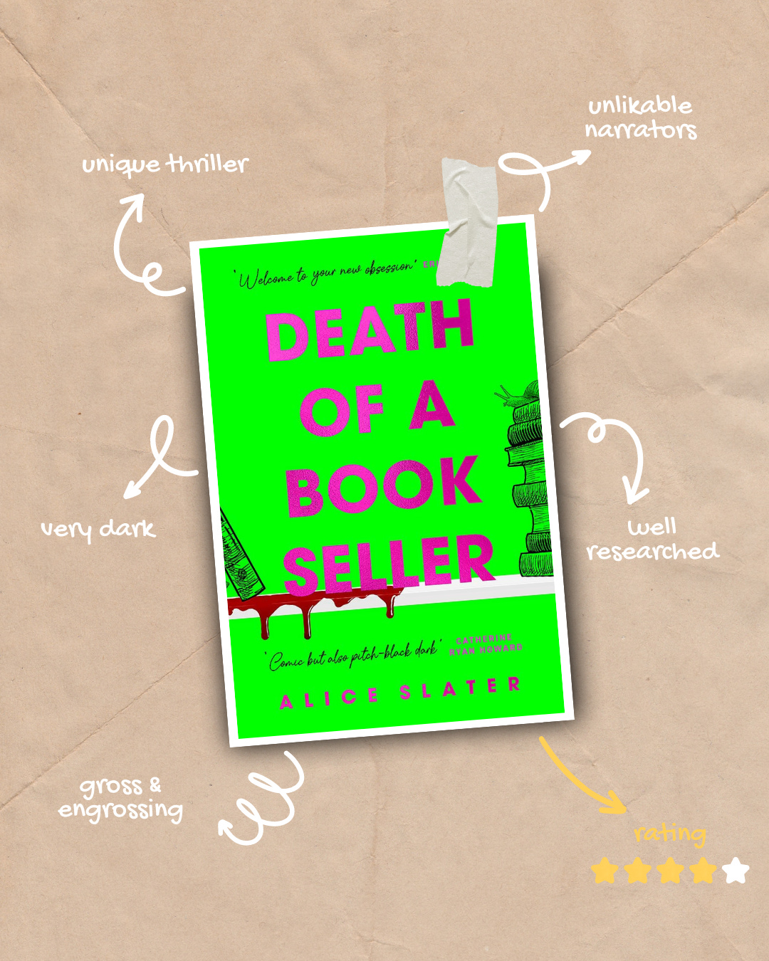 This really is a grotty little book. At times it gave me American Psycho vibes and I felt like I needed a wash. Roach is a bookseller obsessed with true crime. She curates her true crime section with obscure self-published titles and keeps a stash out back to read on her breaks. Laura, Roach's fellow bookseller, has her own ties to true crime, and what starts as a longing to be friends soon develops into an unhealthy obsession with the star of the bookselling team. I did have concerns that the book was trying to paint all true crime fans as obsessive weirdos. But I think Alice offers good commentary on society's obsession with true crime and how often the victims are forgotten in the narrative. Alice's writing is deliciously disgusting and is narrated really well on audio. I found Roach's over familiarity and desperation to befriend Laura, which ultimately descends into stalking really well done. The ending was a little disappointing, but overall I thought this book was disturbingly enjoyable and a fantastic debut.